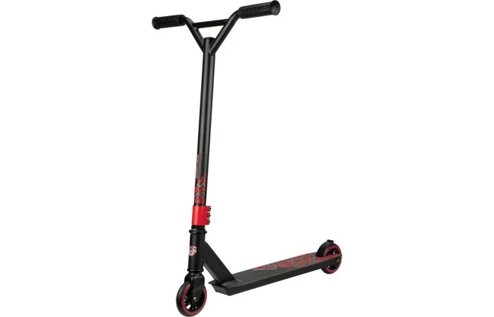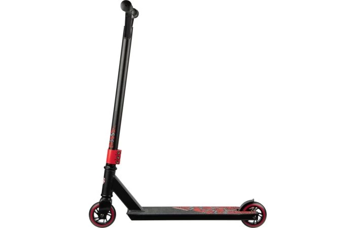 Heb jij zin om te stunten, jumpen en rijden? Met de Black Dragon Inca Trailer Stuntstep kan het allemaal! Deze stevige step heeft een sterke rechthoekige frameconstructie, gemaakt om mee te stunten en trucjes mee te doen. Dankzij de vette zwart met rode design en de graphics ziet de step er superstoer uit en steel je gegarandeerd de show op elke skatebaan. De stuntstep heeft een stalen T-bar stuur met rubberen handgrepen. De uiteinden van het stuur zijn voorzien van stootbescherming, zodat het stuur tegen een stootje kan in het skatepark. Je kunt gemakkelijk remmen met de stalen flex voetrem op het achterwiel en je hebt genoeg grip dankzij de PU-gegoten wielen van 100 mm. De wielen hebben een zwarte aluminium kern, waardoor ze extra stevig zijn en er ook nog eens cool uitzien. De ABEC 9 carbon kogellagers zorgen ervoor dat de wieltjes van deze stunt scooter supersnel en soepel draaien. De maximale belasting is 100 kg en de step komt met twee inbussleutels voor de triple stuurklem en een handleiding.