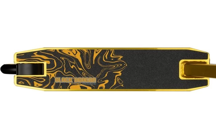 Met de Black Dragon Liquid Gold stuntstep steel jij de show op iedere skatebaan! Het is een super stevige step voor zowel beginnende stunters als voor gevorderden die hun skills verder willen ontwikkelen. Dankzij de ultrasterkte maar uitermate lichte constructie wordt het oefenen van nieuwe trucs een makkie en dus superleuk! De gespaakte 85A wielen zorgen ervoor dat de step soepel rijdt en een goede grip heeft. De aluminium kern zorgt voor extreme duurzaamheid en daarnaast hebben ze ook nog eens een vette hoogglans gouden finish. Met deze flitsende stuntstep word je zéker gespot in het skatepark of op straat!
