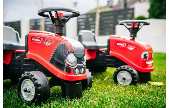 Deze kunststof Falk Case IH rode looptractor heeft een afmeting van 56 x 29 x 31 cm. De looptractor wordt geleverd inclusief aanhanger en accessoires. Het is een mooie looptractor van een robuuste kwaliteit, heeft kunststof wielen die zeer slijtvast zijn en het stuur bevat een toeter met geluidsfunctie. De aanhanger is tevens voorzien van accessoires: een schepje en een harkje.Â