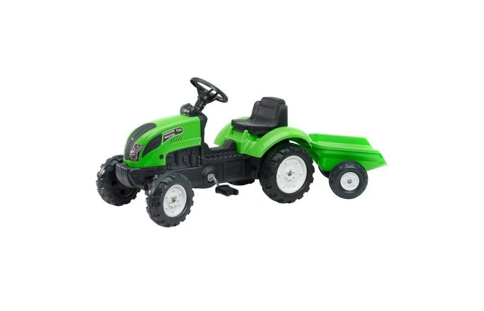 Falk Country Farmer traptractor, speciaal ontworpen voor kleine tuinders die graag zand, bladeren, aarde en kiezelstenen willen laden en vervoeren met de bijbehorende aanhanger. Ontwikkelt autonomie en verbeeldingskracht! Deze groene tractor is erg goed wendbaar, dankzij het directionele stuur met claxon. Voorzien van aanpasbare nummerplaat om een naam op te schrijven, of een bijnaam te geven aan deze leuke trekker!