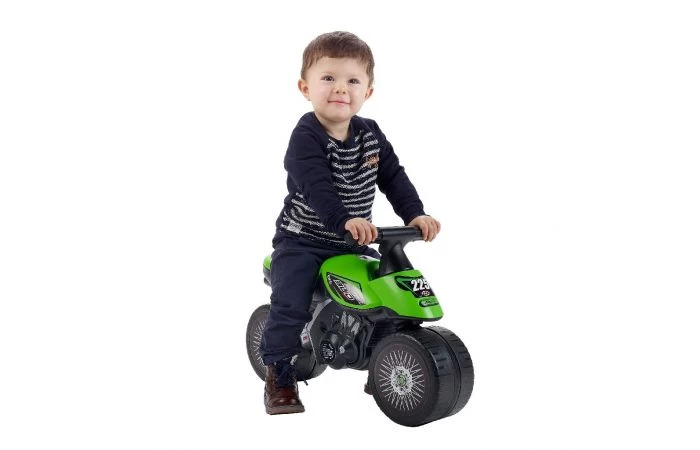 Kawasaki Bud racing motorfiets, in groen met zwarte kleurstelling. Met robuuste wielen: helpt de balans te ontwikkelen tijdens het spelen. Geschikt om zowel binnen als buiten te gebruiken.