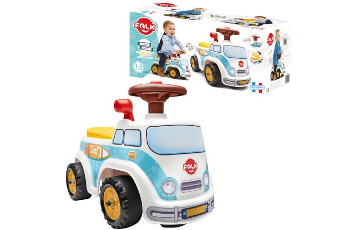 Schattige surfer minibus van Falk. Met zijn mooie ronde vormgeving en felle kleuren wordt dit vast het favoriete loopfiguur van jouw kindje! Deze minivan is super wendbaar dankzij het directionele stuur met claxon. Hij heeft ook een uitstekende stabiliteit, zodat jouw kindje zijn of haar motorische vaardigheden veilig en in stijl kan ontwikkelen! Er is een klein opbergvak verborgen onder de stoel. Ideaal om wat zandspeelgoed mee te nemen om op het strand te spelen. Voorzien van aanpasbare nummerplaat om een naam op te schrijven, of een bijnaam te geven aan deze leuke ride-on!