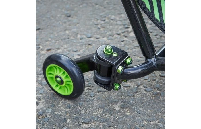 De achterwielen hebben inderdaad een uniek zwenksysteem waardoor de Bikez Snake superwendbaar wordt. Door met je zitvlak extra kracht op de achterwielen uit te oefenen stuurt de Bikez Snake zowel aan de voor- als achterzijde, waardoor er een extreem kleine draaicirkel ontstaat.