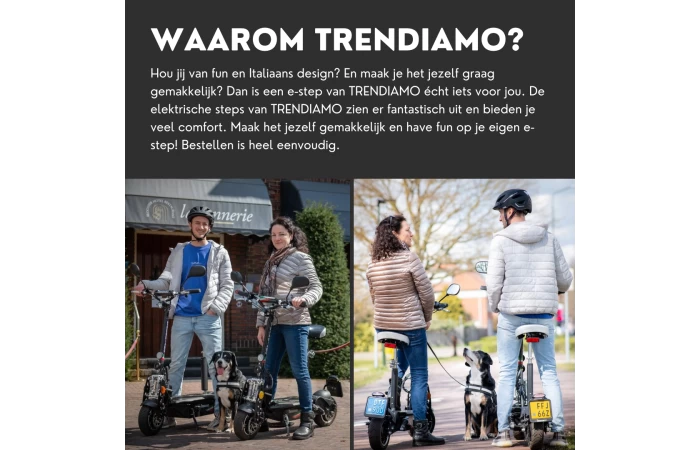 De nieuwe kettingloze opvouwbare Trendiamo Country Far Drive Elektrische step wordt aangedreven door een 500 Watt hub-motor. Ideaal om mee te nemen op vakantie, in de bus, de trein of in uw auto. De e-step vouw je vervolgens weer snel uit, en rijden maar. De Trendiamo country kan in Nederland op kenteken worden gezet, zo kan de step verzekerd worden als snorfiets en als scootmobiel.Â