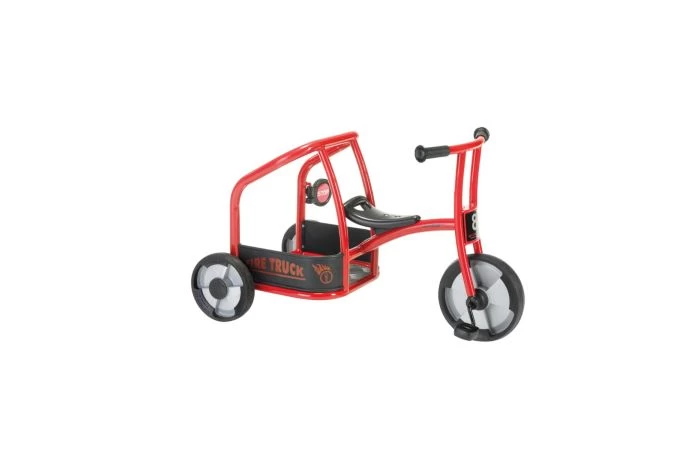 Stap met 2 brandweermannen en jullie uitrusting op deze driewieler en ga op weg naar de brand! De driewieler brandweer is robuust, veilig en duurzaam. Frame van buizenstaal, zonder scherpe hoeken of kanten. Achter deze driewieler kan een aanhanger gekoppeld worden met de veiligheidskoppeling.
