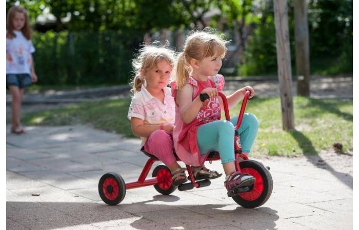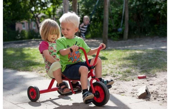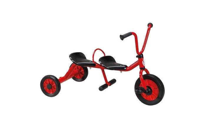Neem je vriendje mee voor een ritje over het speelplein. De duodriewieler mini is robuust, veilig en duurzaam. Frame van buizenstaal, zonder scherpe hoeken of kanten.